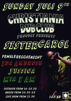 Søndag den 9. Juli slår vi dørene op til et bas brag af en sommerfest når vi har en af Jamaica og USA stærkeste kvindelige sanger på mikrofonen: Sister Carol! Som opvarmning har vi inviteret vores Christiania homegirls Ida Ambrose, Jessica og MIA I AM.