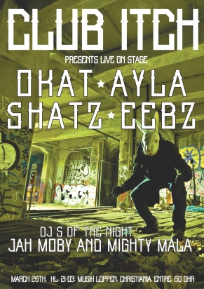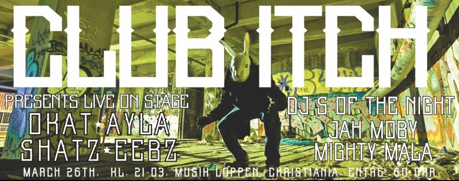 Til første udgave af Club Itch påskelørdag d. 26. marts præsenteres et program, der vil starte i en den mere afslappende ende med vinyl (roots/rock steady/early dancehall) og ragga-rap og slutte natten af i den mere hårde og rå stil med gaderap direkte ud af Nørrebro og tung hip hop. Vi bringer det bedste upcoming fra begge sider af Øresund. Aftenens host er rapper/beatboxer/afrobeat kunstner Nappion/Fufu Afreaq (Okay Funky).