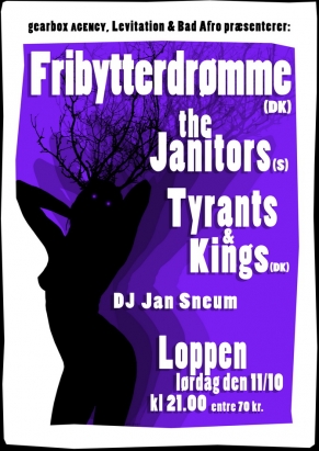 I en lejlighed på Nørrebro, bag pladebutikken Repo Man i Fensmarkgade, holder pladeselskaberne Bad Afro Records og Levitation til sammen med booking bureauet gearbox AGENCY. En varm sommerdag blev det besluttet at lave en fælleskoncert med aktuelle navne og den bliver nu en realitet lørdag den 11/10 på Loppen i København. Levitation byder på de snart album debuterende Fribytterdrømme, gearbox AGENCY præsenterer Tyrants & Kings, der for nyligt udgav deres 3. album, og Bad Afro hiver The Janitors ned fra Stockholm, fordi de udgiver en 12” EP på selskabet den 22. september. Jan Sneum binder aftenen sammen bag DJ pulten.